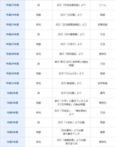 国語の入試傾向を押さえたところで予想に入ります。国語で傾向を探れるのは「韻文」「古典」「文法」「小問」と限られてきます。これらの出題データを分析し予想してみましょう。