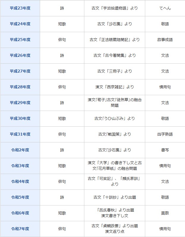 という出題傾向。(「漢文」といっても書き下し文。リアルな漢文は16年で1回だけの出題)